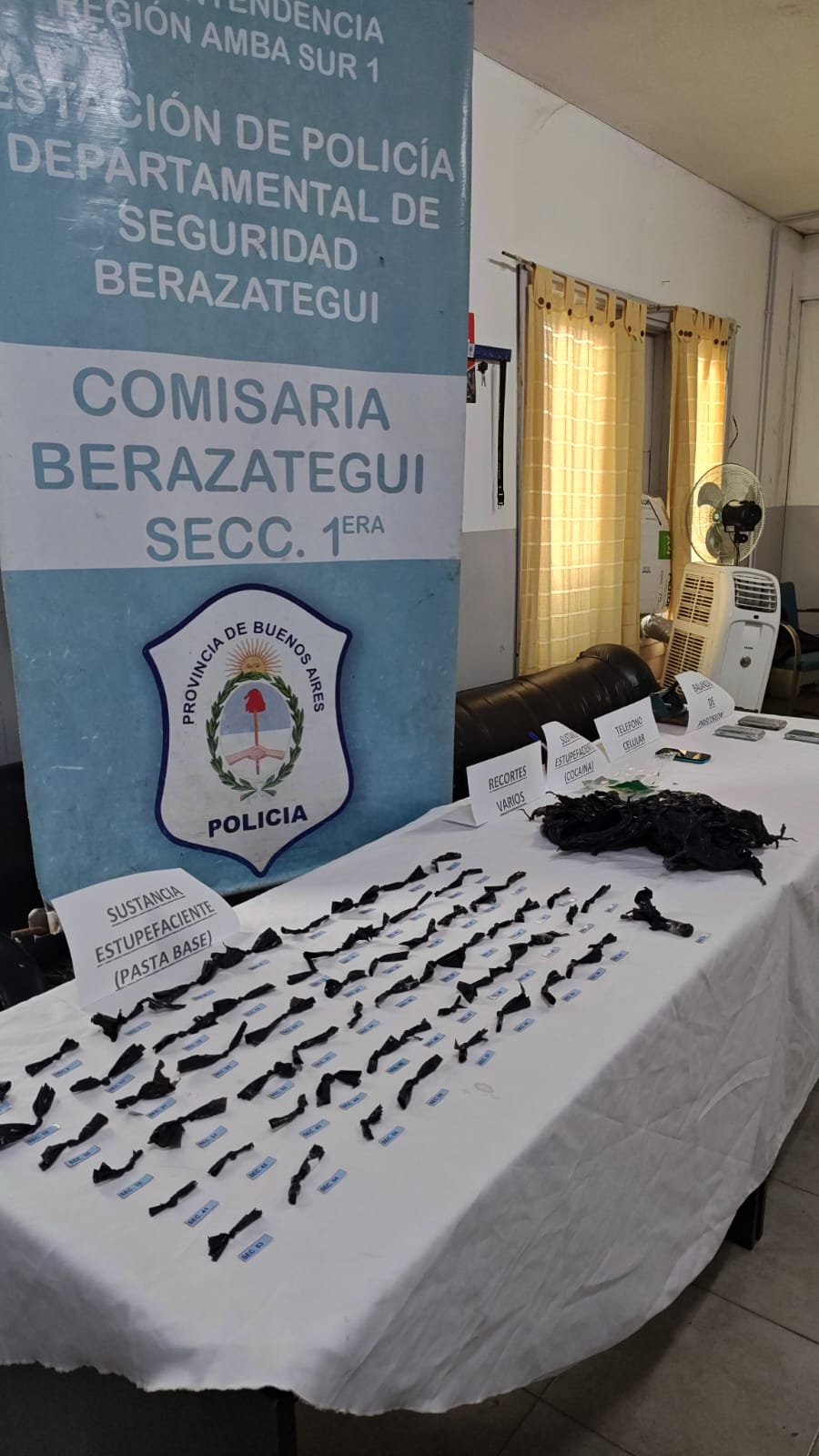 En la requisa del inmueble se secuestraron 62 envoltorios que contenían una sustancia amarillenta compatible con pasta base —con un peso total de 32 gramos—, además de un envoltorio con clorhidrato de cocaína de aproximadamente 5 gramos, tres balanzas de precisión y un teléfono celular.